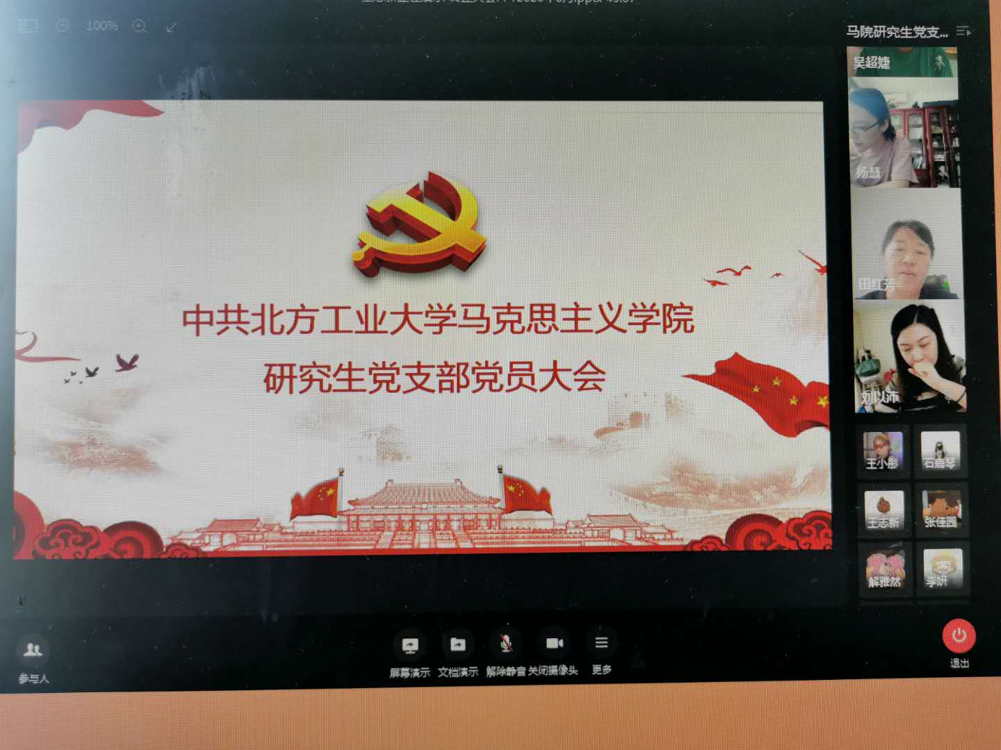 6月18日上午,pp电子官方网站研究生党支部通过视频会议,召开讨论关于预备党员郝璞琦、吴超婕两位同志的转正会议。参加本次会议的人员有校党委副书记田红芳、党支部书记刘以沛、支部全体党员同志,及支部全体积极分子。