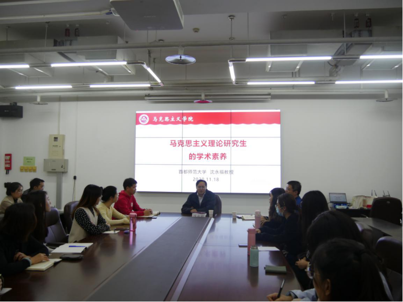 11月18日下午,pp电子官网特邀首都师范大学pp电子官方网站副院长、北京高校中国特色社会主义理论研究协同创新中心(首都师范大学)常务副主任、北京市伦理学会副秘书长、首都师范大学社会文化史研究中心研究员、北京市委讲师团宣讲专家沈永福教授,在瀚学楼1208会议室主讲题为《马克思主义理论研究生的学术素养》的学术报告,pp电子官网全体研究生到场聆听,报告由pp电子官网副院长张茂林主持。