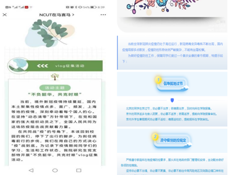 此外,为记录疫情期间的学习和生活状态,同学们积极参加学院“不负韶华,共克时艰”为主题的vlog征集活动,坚定“疫”战到底的决心和信念。