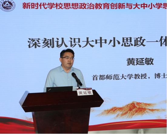 首都师范大学教授黄延敏、北京市第九中学校长林乐光分别做特邀报告。黄延敏梳理了深刻认识、继续推进大中小思政一体化建设应当遵循的根本要求,指出了当前大中小学思政一体化建设方面存在的主要问题,并提出了系统性的解决思路。林乐光分析了“一体化”是纵向衔接、横向交接的一体化,是德智体美劳五育并举的一体化,要打造丰富的大思政课程,厚育大国良师。